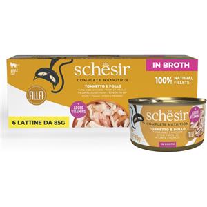 Schesir Alimento Umido Completo per Gatti - Filetti di Tonno e Pollo in Brodo, 6 x 85 g