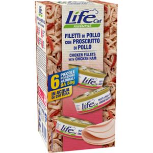 Life Cat Filetti di Pollo con Prosciutto - Multipack 6x50gr, 100% Naturale e Cotto al Vapore