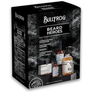 Bullfrog - Kit Beard Heroes, Agnostico Balsamo Multifunzione Originale 100ml, Pasta Esfoliante Lavabarba 100ml, Oliocento 50ml, Fluido Detergente Delicato 250ml