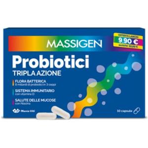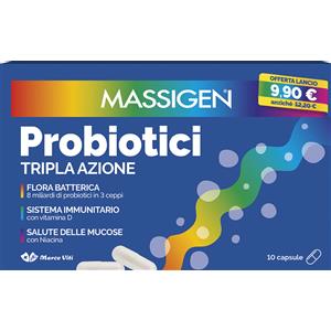 Massigen Probiotici Tripla Azione - Integratore Alimentare con 8 Miliardi di Fermenti Lattici, Niacina e Vitamina D, 10 Capsule in Integratori e Vitamine