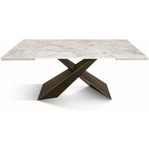 KONTE.DESIGN Tavolo FIGARI allungabile in vetroceramica bianco arabesco con gambe a X in metallo bronzo, 180x90 cm - 260x90 cm
