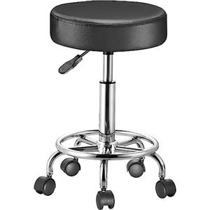 BAKAJI Sgabello Rotondo con Ruote in Ecopelle Nera, Altezza Regolabile, Base in Acciaio Zincato e Imbottitura da 10 cm