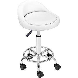 BAKAJI Sgabello con Ruote Bianco, Seduta Imbottita e Schienale Basso in Ecopelle, Base Girevole in Acciaio con Poggiapiedi, Altezza Regolabile, Ideale per Estetista e Ristoranti