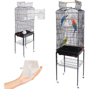 BAKAJI Gabbia Voliera per Uccelli con Tetto Apribile, Mangiatoie, Posatoi in Legno e Piedistallo con Ruote - 46x35x148 cm (Nero)