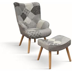KONTE.DESIGN Poltrona HAVANA in tessuto patchwork grigio con poggiapiedi, stile moderno e versatile, ideale per salotto o camera da letto