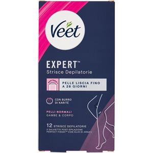Veet Strisce Depilatorie Expert Corpo e Gambe Pelli Normali, 12 Strisce con Burro di Karité e Salviette Post-Epilazione