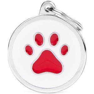MyFamily Medaglietta per Cane Personalizzabile in Metallo Smaltato - Cerchio Grande Bianco con Zampa Rossa