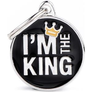 MyFamily Medaglietta Personalizzata per Cani e Gatti - Cerchio 'I'm The King', Colore Nero e Argento, Dimensioni 2,6x3,1 cm