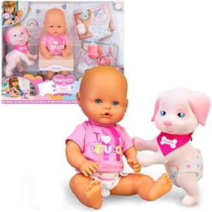Nenuco & Petuco, Bambola 35 cm, con cucciolo Petuco, con accessori per entrambi: pannolino, ciuccio e biberon, per bambine/I +3 Anni, Famosa (NFNA6000)