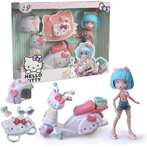Famosa Hello Kitty Pretty Pink Scooter - Bambola Giapponese con Moto, 19,5 cm, 15 Punti di Articolazione, Casco e Borsa Inclusi, 4 Anni