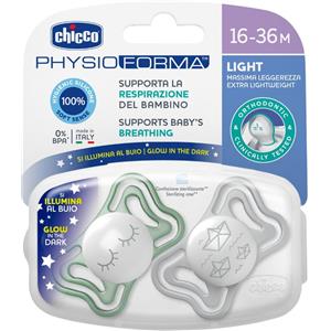 Chicco Succhietto PhysioForma Light Lumi in Silicone 16-36 Mesi - Extra Leggero e Luminescente, 2 Pezzi