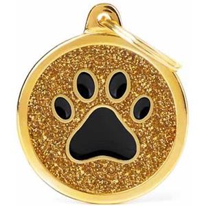 MyFamily Medaglietta per Cane Shine - Cerchio Grande Glitter Oro con Zampa Nera, 32x37 mm