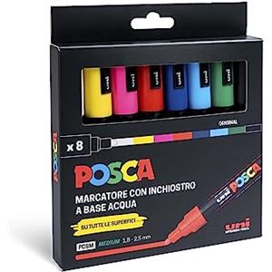 Uni Posca Marcatore a Tempera Punta Tonda 1,8-2,5 mm - Confezione da 8 Pezzi, Inchiostro Pigmentato a Base d'Acqua, Resistente alla Luce e all'Acqua