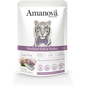 Amanova Cibo Umido per Gatti Sterilizzati al Pesce Bianco e Tacchino - 85 g - Grain Free e Ricco di Minerali