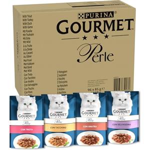 Gourmet Perle Cibo Umido per Gatti - Filettini in Gelatina con Trota, Tacchino, Anatra e Selvaggina - 96 Buste da 85g