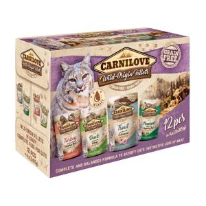 Carnilove Multipack Cibo Umido per Gatti - 12 Bustine da 85 g con Tacchino e Valeriana, Anatra e Erba Gatta, Trota e Echinacea, Fagiano e Foglie di Lampone - 85% Carne Selvatica