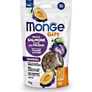 Monge Snack per Gatti Hairball 50 g - Ricco in Salmone Fresco e Prugna, Alimento Complementare per Gatti Adulti