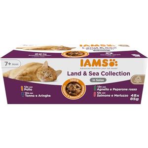 IAMS Cibo Umido per Gatti Senior 7 - Land & Sea Collection in Salsa, Multipack 48 x 85 g con 4 Gusti
