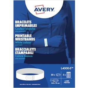 Avery L4000-5 Braccialetti Identificativi Stampabili Bianchi 265x18 mm - Confezione da 5 Fogli (10 Etichette per Foglio) - Ultra Resistenti e Flessibili