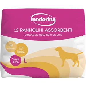Inodorina Pannolini Assorbenti Usa e Getta Taglia L per Cani Femmine 10-20 kg, 12 Pezzi con Tecnologia Traspirante e Indicatore di Bagnato