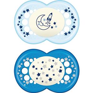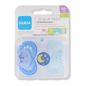 MAM Succhietto Original Night 16 in Silicone Azzurro - 2 Pezzi, Doppio Maschio, Illumina al Buio