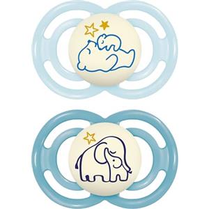 MAM Perfect Night Succhietto Doppio 16 Mesi in Silicone che Si Illumina al Buio con Porta Ciuccio - Azzurro